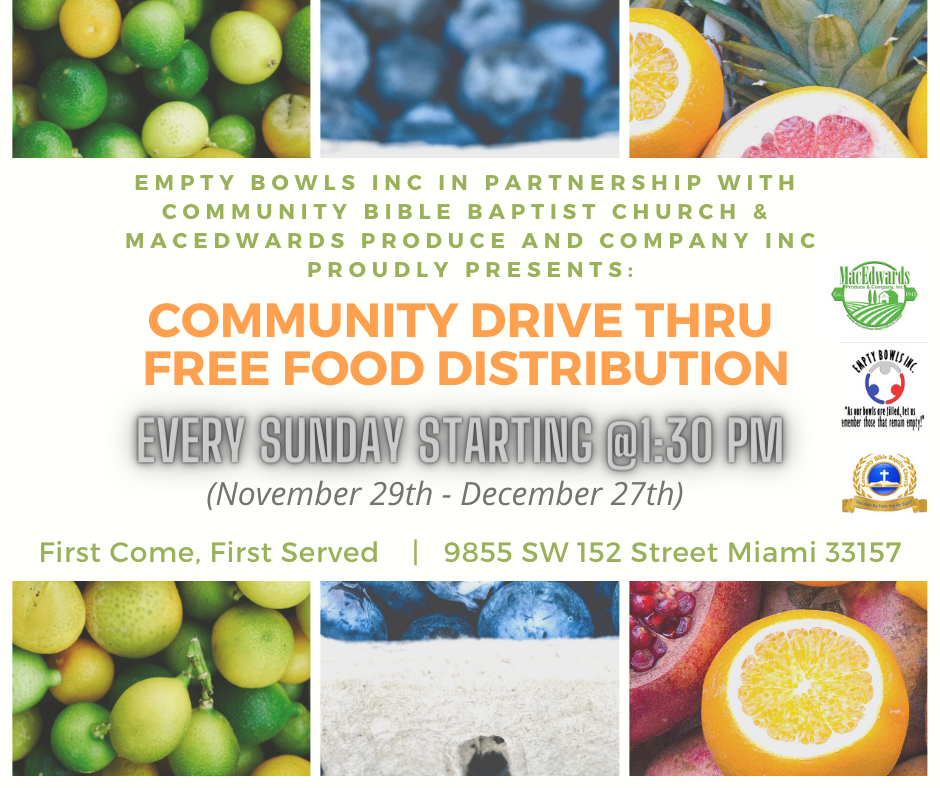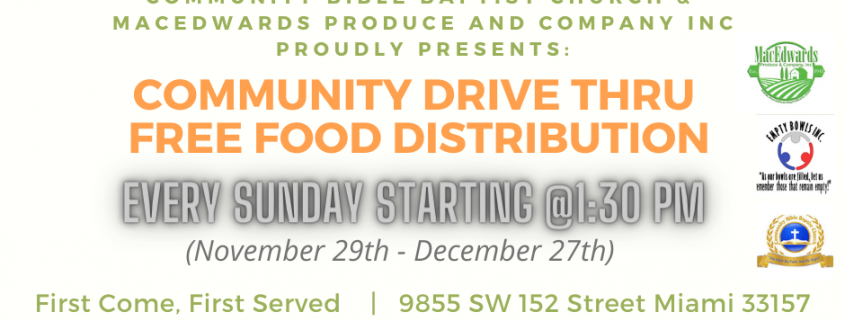 CBBC will host a drive-thru free food distribution EVERY SUNDAY at 1:30 PM (Nov 29-Dec 27), open to the entire community! We will be following CDC Social Distancing Guidelines and require that you please wear your masks.